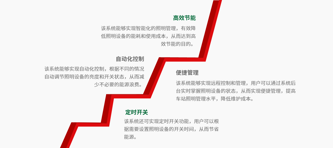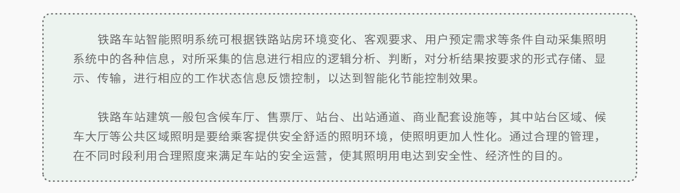 鐵路車站智能照明系統(tǒng)可根據(jù)鐵路站房環(huán)境變化、客觀要求、用戶預(yù)定需求等條件自動(dòng)采集照明系統(tǒng)中的各種信息,對(duì)所采集的信息進(jìn)行相應(yīng)的邏輯分析、判斷,對(duì)分析結(jié)果按要求的形式存儲(chǔ)、顯示、傳輸,進(jìn)行相應(yīng)的工作狀態(tài)信息反饋控制,以達(dá)到智能化節(jié)能控制效果。