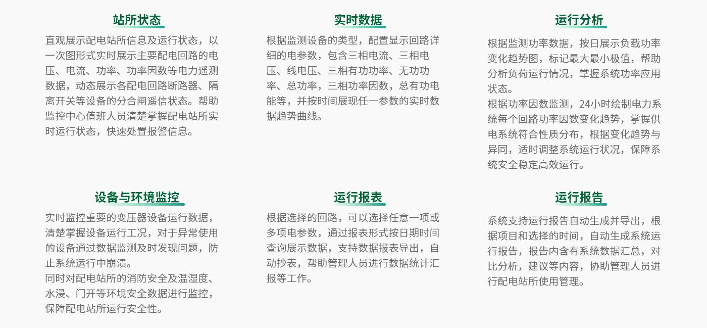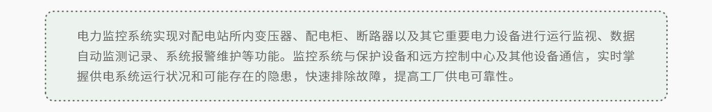 電力監(jiān)控系統(tǒng)實(shí)現(xiàn)對(duì)配電站所內(nèi)變壓器、配電柜、斷路器以及其它重要電力設(shè)備進(jìn)行運(yùn)行監(jiān)視、數(shù)據(jù)自動(dòng)監(jiān)測(cè)記錄、系統(tǒng)報(bào)警維護(hù)等功能。
